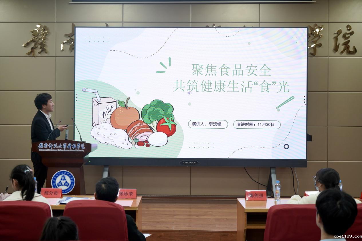 本次比赛共有20位选手参赛。选手们围绕食品安全主题,从多个角度进行了深入探讨。揭示了校园食品安全的现状和存在的问题,通过日常生活中的食品为切入点,针对食品的来源和加工过程进行分析,内容充实、逻辑严谨,引发了大家的深思和共鸣。同时,探讨了食品安全与健康关系,既有理论依据、又有真实案例。评委们从选手的语言表达、演讲内容和仪容仪态等多个方面进行综合评分,最终评选出了一等奖1名,二等奖2名,三等奖5名,以及若干优秀奖。