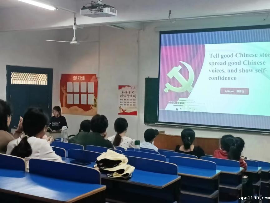程嘉怡同志以“讲好中国故事,传播好中国声音,展现自信”为主题,用英文讲述中国故事,传播中国声音。充分展示外语学子独有的自信和新时代的使命担当。讲解中,她引用习近平总书记的讲话“展形象,就是要推进国际传播能力建设,讲好中国故事、传播好中国声音,向世界展现真实、立体、全面的中国,提高国家文化软实力和中华文化影响力。”于外语学子而言,承担起新时代赋予的新使命就是要发挥好专业优势,用外语讲好中国优秀传统文化的故事、中国特色社会主义的故事、中华儿女为实现伟大复兴梦而努力奋斗的故事,为扩大中华文化影响力、促进人类文明交流互鉴,贡献力量。